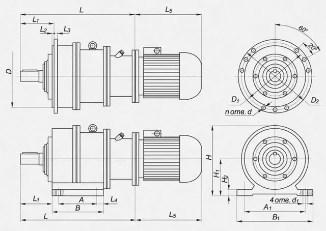 | Тип мотор-редуктора | d | d1 | d2 | d3 | L | L1 | n |