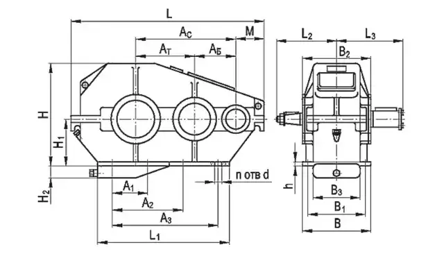 | Редуктор | Н | Н1 | Н2 | h | L | L1 | L2 | L3 | M | d | n, шт | Масса, кг |