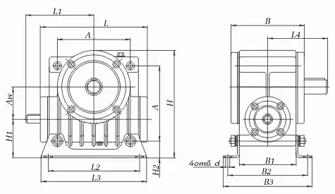 | Редуктор | Aw | А | B | B 1 | B 2 | B 3 | H | H 1 | H 2 | L | L 1 | L 2 | L 3 | L 4 | d |